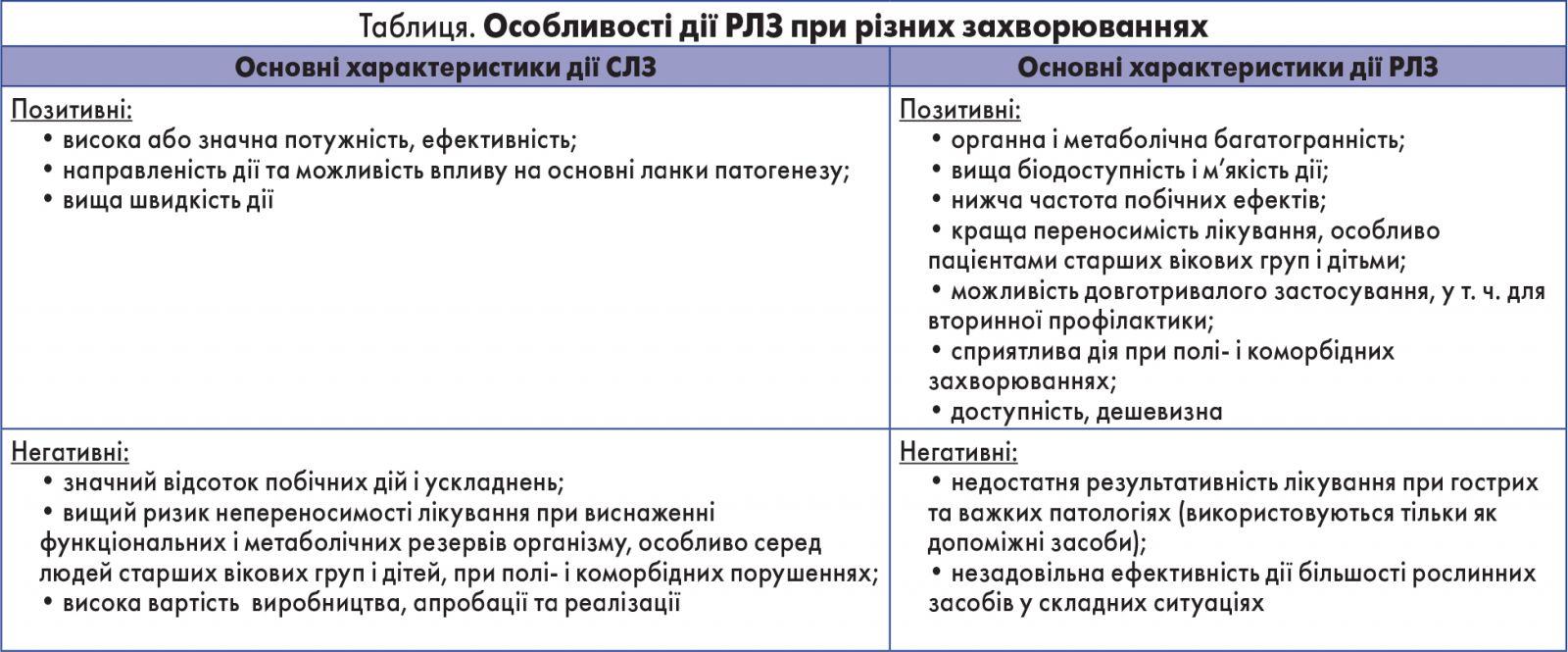 РЛЗ мають певні переваги та недоліки порівняно з сучасними ліками синтетичного походження (табл.).