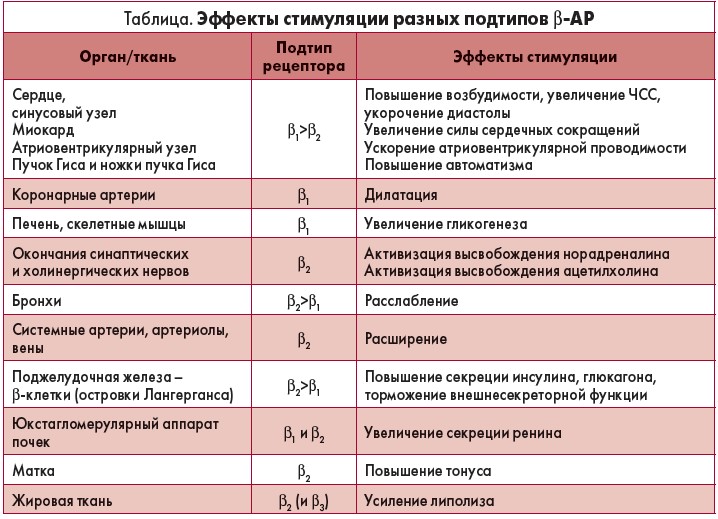 Соотношение содержания β1- и β2-АР в различных органах неодинаково, что обусловливает особенности эффектов селективных и неселективных БАБ. Например, в сердце превалируют β1-АР, в бронхах – β2-АР. Степень селективности препарата характеризует индекс селективности (ИС) – отношение степени влияния на β2- и β1-АР. Так, ИС пропранолола составляет 1:8; метопролола – 1:20; атенолола и бетаксолола – 1:35 (являются селективными). Селективность бисопролола еще более выражена, о чем свидетельствует значение ИС – 1:75 (J.G. Baker, 2005; S.L. Nuttall et al., 2003). В таблице приведены эффекты стимуляции β-АР, находящихся в разных органах (блокада рецепторов, естественно, вызывает противоположный эффект).
