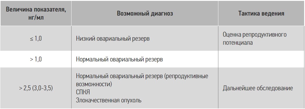 На основании полученного результата обследования на АМГ разрабатывается план ведения и наблюдения за пациенткой (таблица). При этом более значимой для диагностики является динамика показателей. Кроме того, следует учитывать, что в ряде исследований продемонстрирована ассоциация между низким уровнем АМГ и повышением ТТГ; недостаточностью витамина D.
