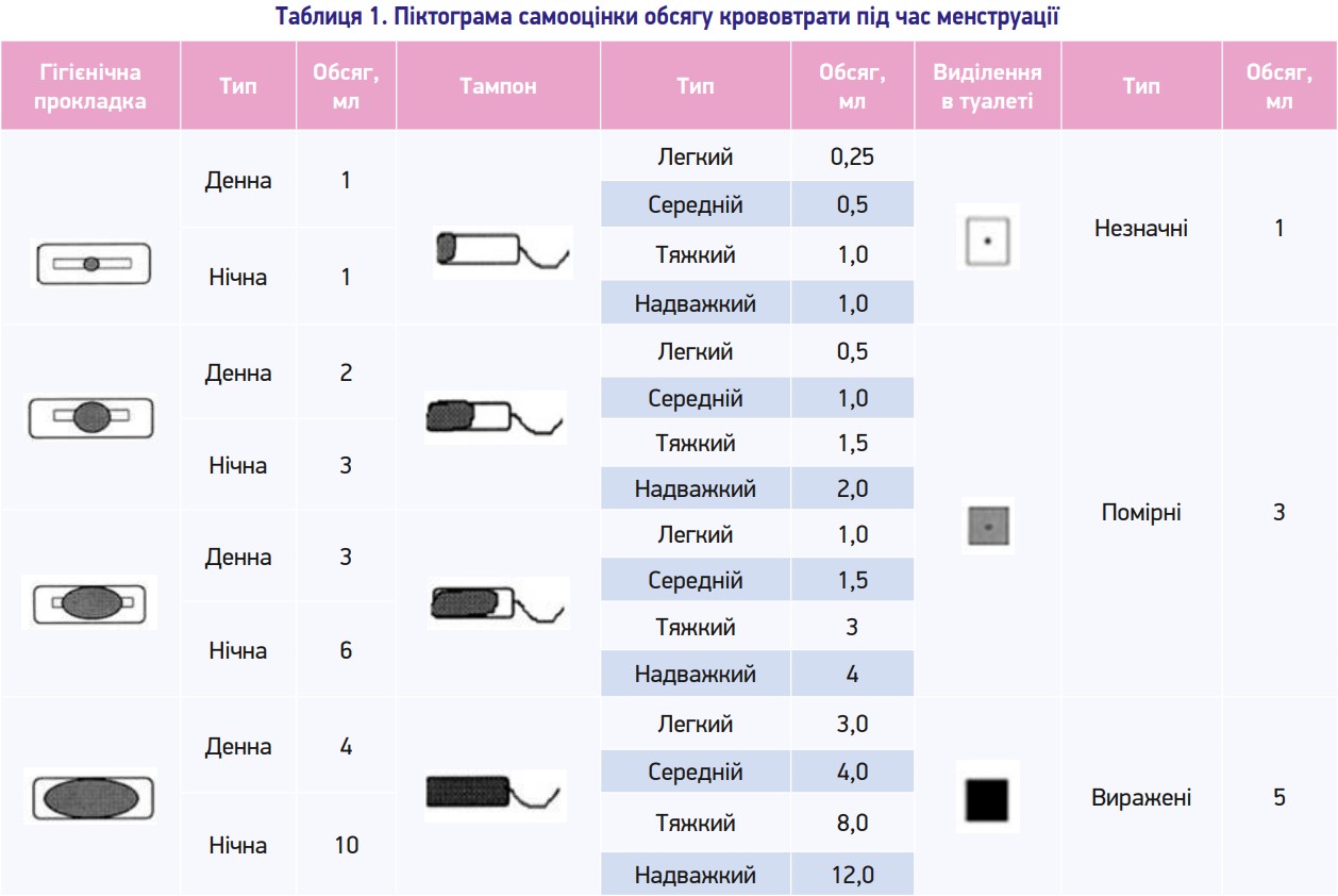 Самооцінка обсягу крововтрати (піктограма) – це візуально-аналоговий метод оцінки обсягу менструальної крововтрати за об’ємом крові на гігієнічній прокладці (денній та нічній), тампоні й за виділеннями в туалеті (метод суб’єктивний). Ступені крововтрати представлені в піктограмі (уніфікований клінічний протокол медичної допомоги «Аномальні маткові кровотечі», затверджений наказом МОЗ України від 13.04.2016 р. № 353) (табл. 1).