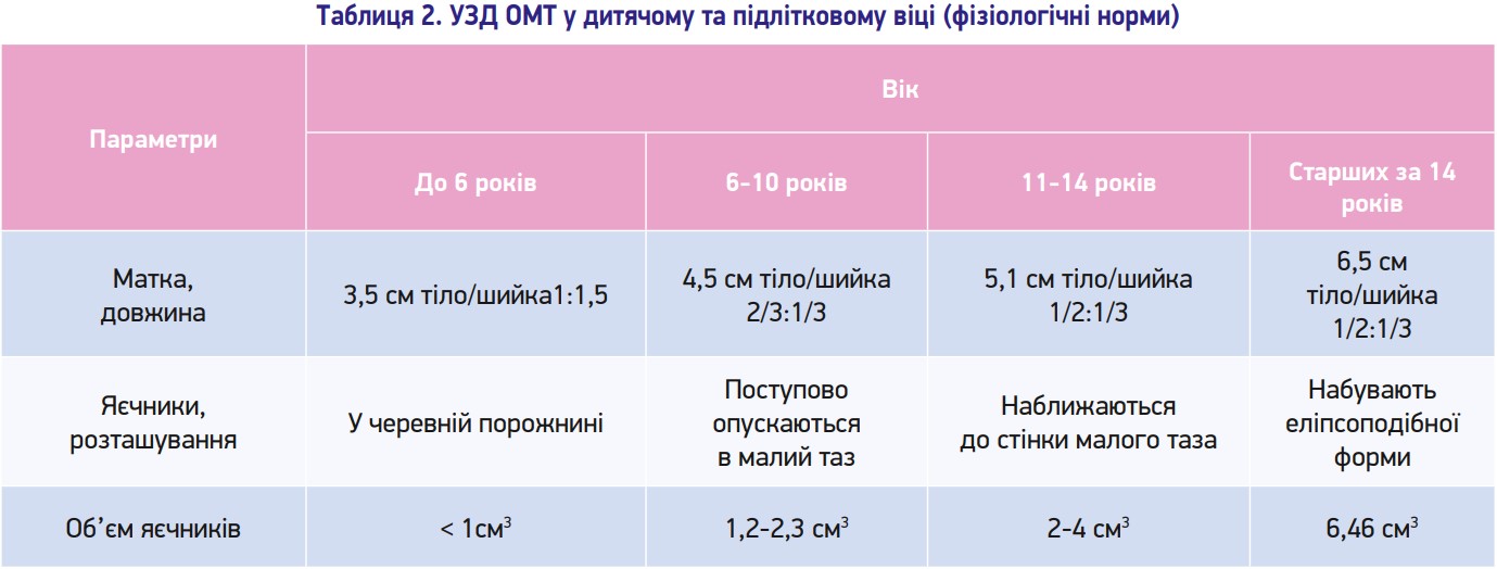 Методом ехографії ОМТ визначають форму, розміри і структуру матки, товщину (d), рівномірність та ехогенність ендометрія, структуру, розміри, об’єм і товщину капсули яєчників (табл. 2). Обов’язково слід виключити наявність вагітності.