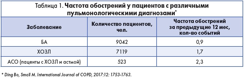 Также для сочетания ХОЗЛ и БА характерными являются более частые обострения. Для сравнения, частота обострений у пациентов с различной нозологией представлена в таблице 1.