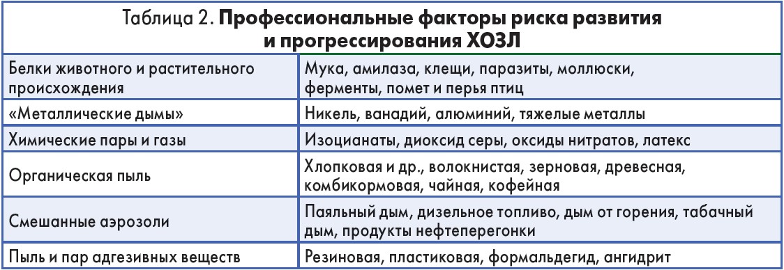 Профессиональные факторы риска развития ХОЗЛ перечислены в таблице 2.