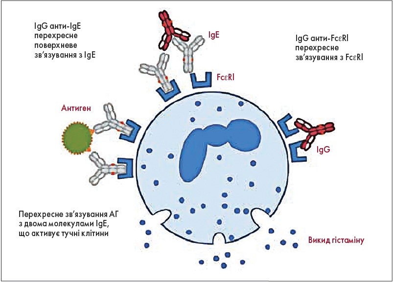 Тучні клітини (ТК) і, можливо, базофіли – ключові клітини в патогенезі кропив’янки. Гістамін, що вивільняється ними, та інші медіатори, такі як фактор активації тромбоцитів і цитокіни, призводять до активації сенсорних нервових закінчень, вазодилатації та екстравазації плазми, а також до залучення інших клітин у шкіру, що клінічно проявляється уртикарними висипаннями і свербежем. Сигнали, що активують ТК, гетерогенні й різноманітні. За даними ряду авторів, ключовим рецептором ТК при хронічній спонтанній кропив’янці (ХСК) є Fc-RI-високоафінний рецептор до імуноглобуліну Е (IgE). Перехресне зв’язування цих рецепторів на поверхні клітини призводить до її активації та вивільнення медіаторів, головним із яких щодо кропив’янки є гістамін (рис. 1).