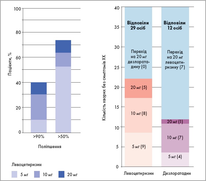 Прикладом ефективності левоцетиризину в стандартних і підвищених дозах може служити подвійне сліпе дослідження, проведене серед дорослих (19-67 років) хворих на ХК, які були рандомізовані у групи (40/40), що отримували лікування левоцетиризином або дезлоратадином. Лікування було розпочато зі стандартних доз 5 мг, із наступним щотижневим підвищенням на 5 мг до 20 мг за відсутності ефекту. Пацієнтів без відповіді на 20 мг переводили на інший препарат. Як видно з рис. 3, більша кількість хворих на ХК відповіли на терапію левоцетиризином (в порівнянні з дезлоратадином) як у стандартних, так і у підвищених дозах. При цьому підвищення доз АГП 2-го покоління не супроводжувалося збільшенням небажаних побічних ефектів, зокрема сонливості.