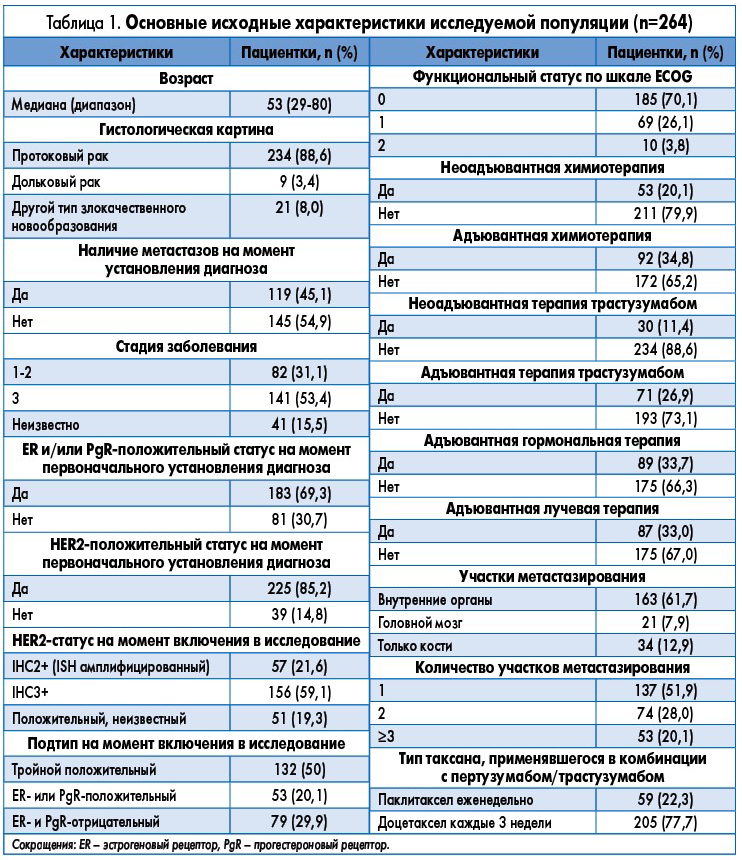 Из 264 включенных в исследование пациенток 145 (54,9%) имели рецидив заболевания со значением медианы длительности безрецидивного интервала, равным 53 мес (диапазон – 7-342), тогда как 119 пациенток (45,1%) – метастатическое заболевание de novo. На момент начала лечения у 61,7% пациенток были выявлены висцеральные метастазы, у 12,9% – только костные поражения, у 7,9% – асимптомные метастазы в головной мозг, а у 48,1% – множественные участки метастазирования.