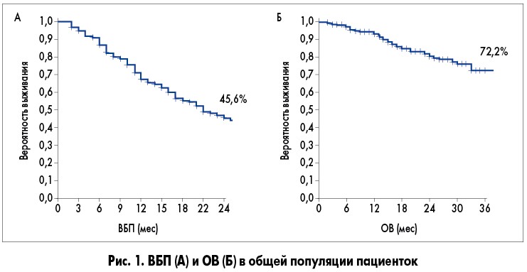В целом у включенных в исследование 264 пациенток медиана ВБП составила 21 мес (95% ДИ 17-25), тогда как медиана ОВ не была достигнута (рис. 1).