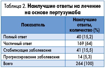 Все пациентки получали режимы лечения на основе пертузумаба в качестве химиотерапии 1-й линии по поводу HER2-положительного распространенного РГЖ, и у них могла быть проведена оценка его эффективности. Медиана длительности периода последующего наблюдения составила 21 мес (диапазон – 3-59). Медиана длительности лечения пертузумабом/трастузумабом и химиотерапии составила 4 мес (диапазон – 1-16), медиана количества циклов химиотерапии равна 6 (диапазон – 1-9). Медиана числа циклов терапии доцетакселом составляла 6 (диапазон – 1-20), а медиана количества еженедельных введений паклитаксела – 16 (диапазон – 2-33). Прекращение применения таксанов наиболее часто было обусловлено кумулятивной гематологической токсичностью.
