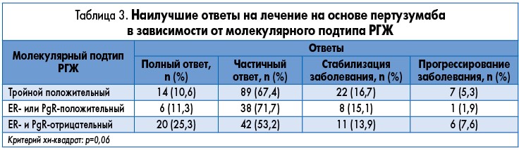 Стабилизация заболевания (СЗ) была зафиксирована у 15,5% пациенток. Клиническая польза (КП), определяемая как ответ на лечение или стабильное течение заболевания на протяжении как минимум 6 мес, была констатирована у 247 (93,6%) пациенток (95% ДИ 90,6‑96,5). Как показано в таблице 3, при выполнении анализа объективных ответов в зависимости от ER/PgR-статуса наблюдались различия, не достигшие статистической значимости (p=0,06).
