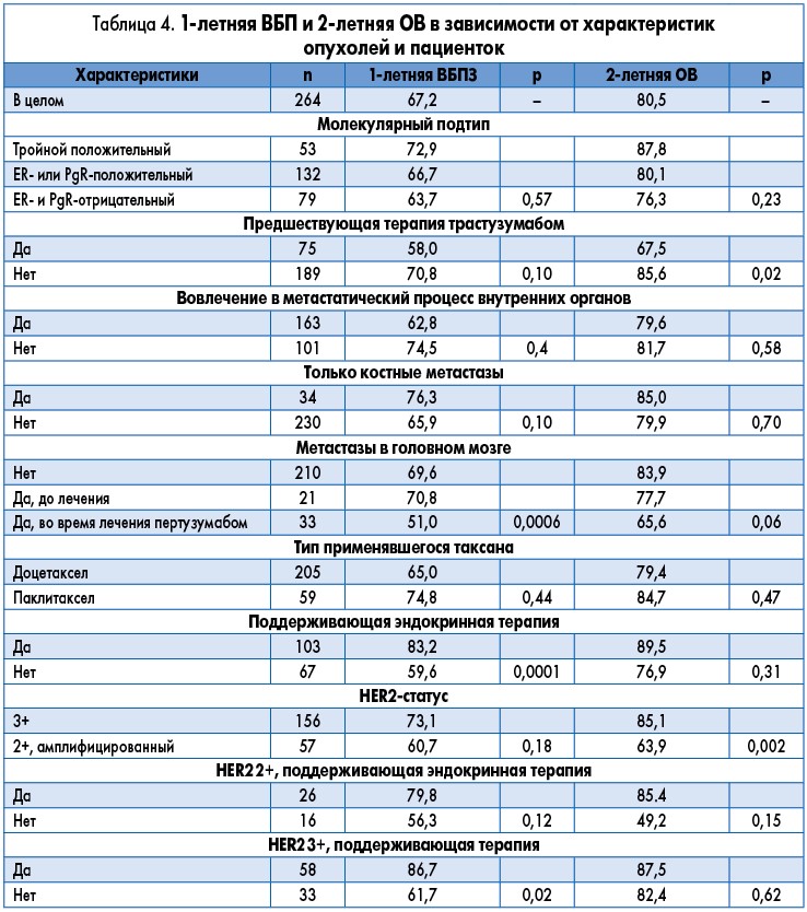 В нашей популяции пациенток имелась подгруппа больных с ранним рецидивом (во время или до истечения 12 мес с момента завершения адъювантной терапии трастузумабом, n=14; 5,3%), тогда как в исследовании Cleopatra имел место 12-месячный интервал между окончанием применения трастузумаба и включением пациенток в исследование. Несмотря на указанные различия, даже в этой подгруппе пациенток лечение не продемонстрировало меньшей эффективности. К сожалению, мы не располагаем данными о последующих линиях терапии, которые могли повлиять на результаты в отношении ОВ.