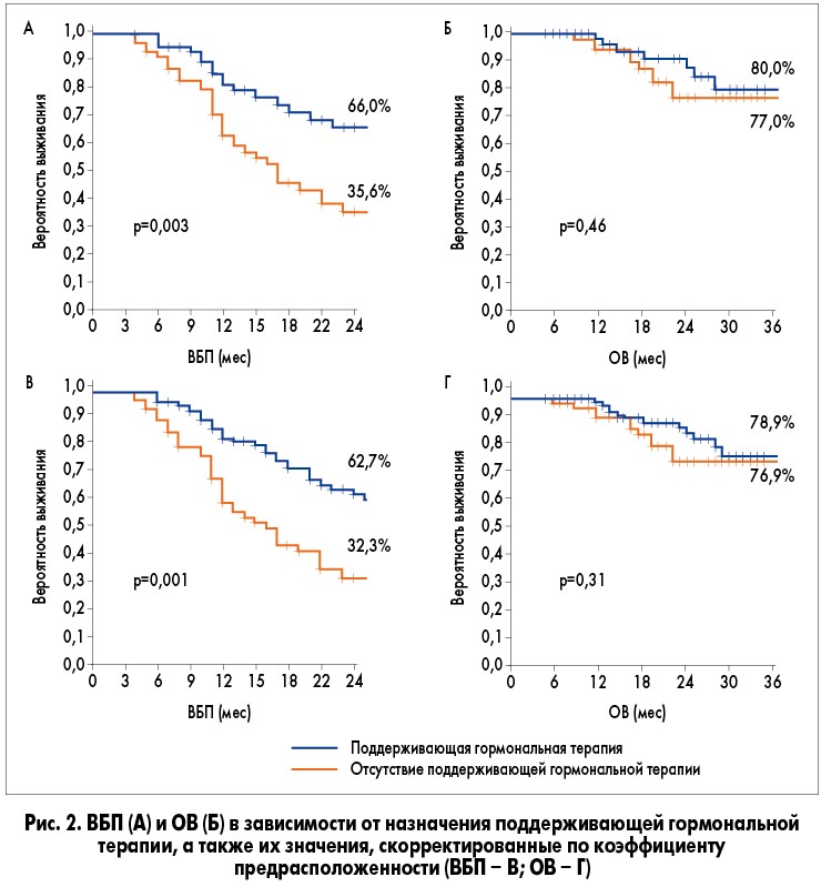 Напротив, каких-либо различий в ОВ в зависимости от поддерживающей эндокринной терапии к настоящему времени не наблюдалось (p=0,31). Результаты были подтверждены при коррекции по коэффициенту предрасположенности – с медианой ВБП 17 мес (95% ДИ 12-22) у пациенток, которые не получали гормональную терапию, и 29 мес (95% ДИ 25-33) у пациенток, которым она назначалась (p=0,003). Каких-либо различий в ОВ в зависимости от проведения поддерживающей эндокринной терапии не наблюдалось и в поле коррекции данных с учетом коэффициентов предрасположенности (p=0,46) (рис. 2В, 2Г).