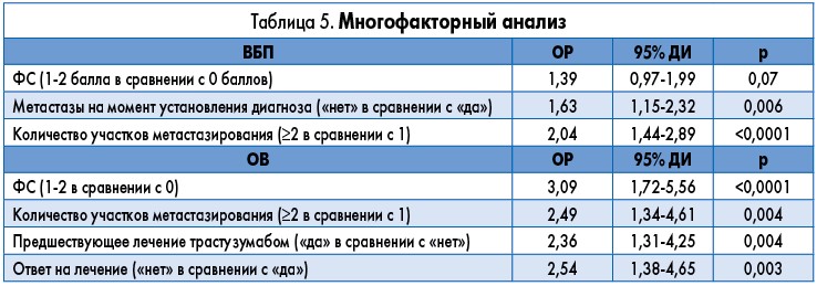При проведении многофакторного анализа (табл. 5) преимущество в плане ВБП было ассоциировано с меньшим значением ФС (p=0,07), наличием метастазов на момент установления диагноза (p=0,006) и наличием единственного участка метастазирования (p<0,0001).