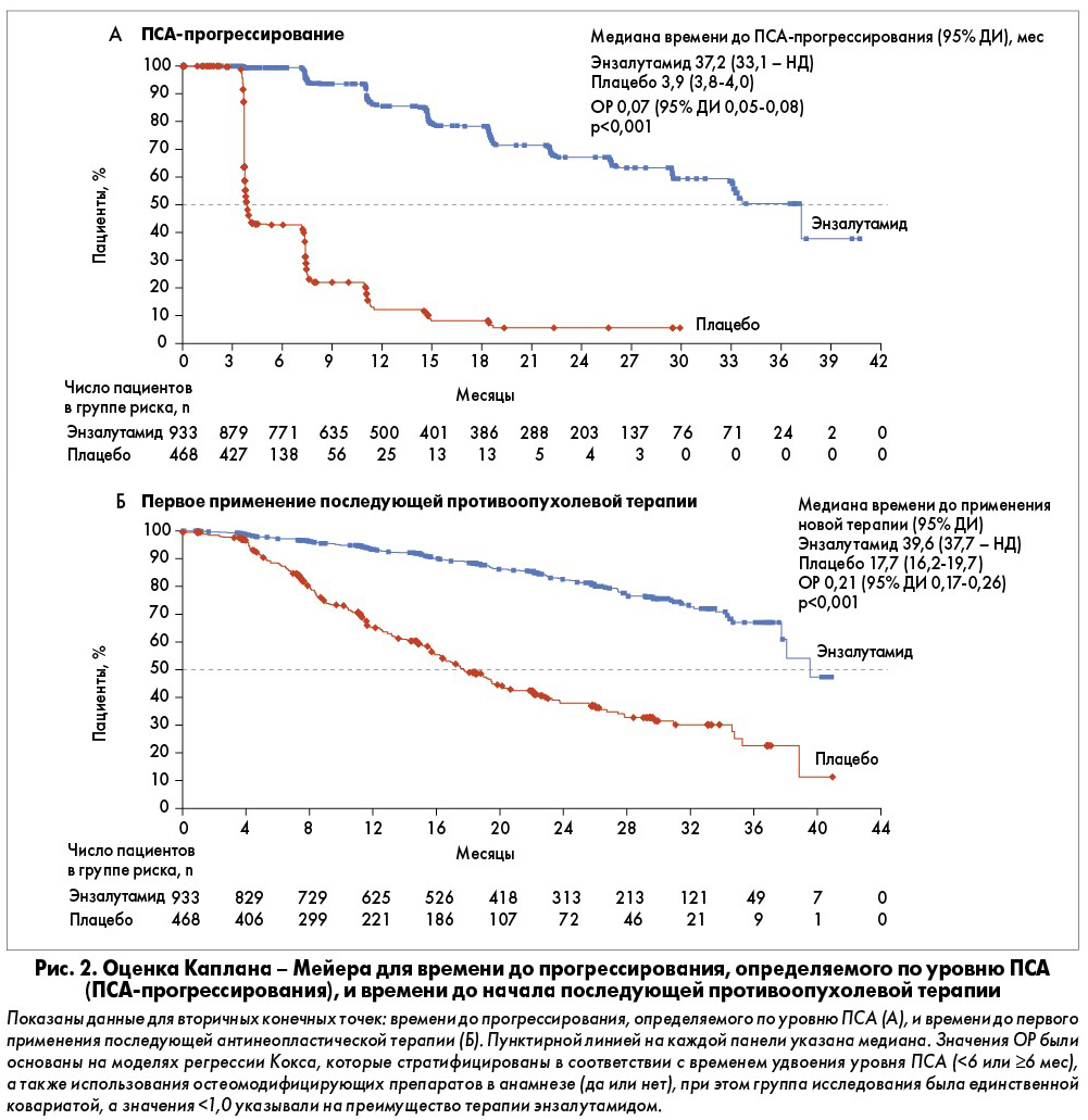 Терапия с применением энзалутамида была более эффективной по сравнению с плацебо в отношении ключевых вторичных конечных точек: времени до прогрессирования, определяемого по уровню ПСА, и времени до первого применения последующей противоопухолевой терапии (табл. 2; рис. 2). Средний период между прекращением исследуемого лечения и назначением другой терапии составил 25 дней в группе энзалутамида и 18 – в группе плацебо. В общей сложности у 138 (15%) пациентов в группе энзалутамида и у 222 (48%) в группе плацебо было прекращено лечение в рамках исследования и начата последующая противоопухолевая терапия. Наиболее часто с этой целью применялся абиратерона ацетат (38% в группе энзалутамида и 36% в группе плацебо).