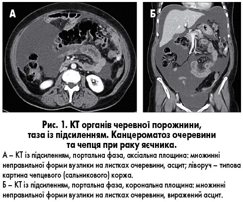 Метастатичне ураження очеревини та чепця на КТ має вигляд полігональних та овоїдних вузликів неправильної форми, що розташовані на листках очеревини, а також у великому чепці. Такі вузли (депозити), як правило, інтенсивно підсилюються, мають перифокальне ущільнення, тяжистість, підвищену щільність жирової клітковини; уражений чепець на КТ може мати характерний вигляд коржа (рис. 1).