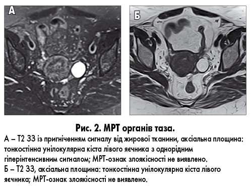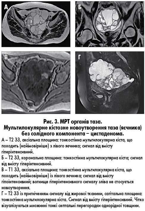 Найширше представлена група новоутворень яєчників, оскільки до неї входять проста параоваріальна кіста, функціональні кісти яєчників (фолікулярні кісти, кісти домінантного фолікула, кісти жовтого тіла), патологічні зміни маткових труб (гідросальпінкс, гематосальпінкс тощо), що мають характерний вигляд на діагностичних зображеннях [9]. Всі вищевказані новоутворення характеризуються наявністю тонких стінок (до 2-3 мм), відсутністю ознак інвазії у сусідні органи. Сигнал від вмісту кістозних новоутворень може бути як класичним (гіперінтенсивним на Т2 ЗЗ, гіпоінтенсивним на Т1 ЗЗ), так і відрізнятися залежно від хімічного складу. У разі наявності у кістах продуктів розпаду крові та залежно від білкового складу рідини сигнал може знижуватися на Т2 ЗЗ, підвищуватися на Т1 ЗЗ. Кістозні унілокулярні новоутворення яєчників майже завжди доброякісні.