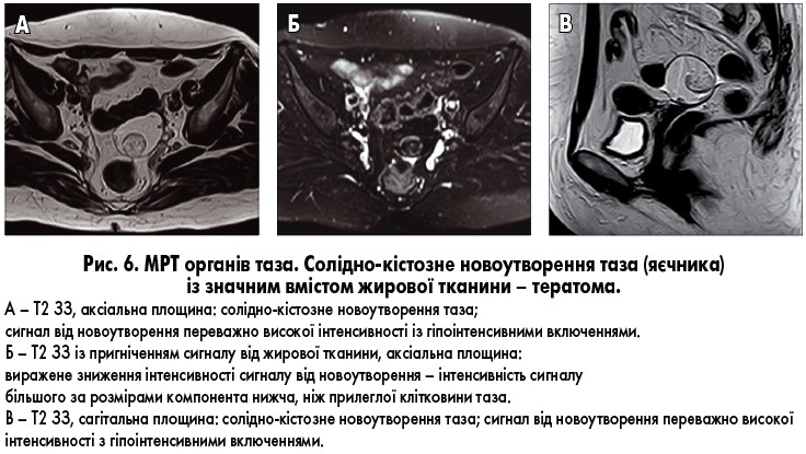 Тератома яєчників, як правило, на діагностичних зображеннях також має вигляд солідно-кістозного новоутворення. Ця пухлина найчастіше зустрічається у молодих жінок фертильного віку (середній вік виявлення близько 35 років). Зріла кістозна тератома має вигляд солідно-кістозного новоутворення із варіабельним контрастним підсиленням; вміст кістозних компонентів має сигнал, що відповідає такому жирової тканини (гіперінтенсивний на нативних Т1 ЗЗ, Т2 ЗЗ зі зниженням сигналу на послідовностях із пригніченням сигналу від жирової тканини), без обмеження дифузії в кістозних компонентах (рис. 6). Потрібно мати на увазі ймовірність наявності заочеревинної злоякісної пухлини (наприклад, ліпосаркоми), що симулює пухлину яєчника.