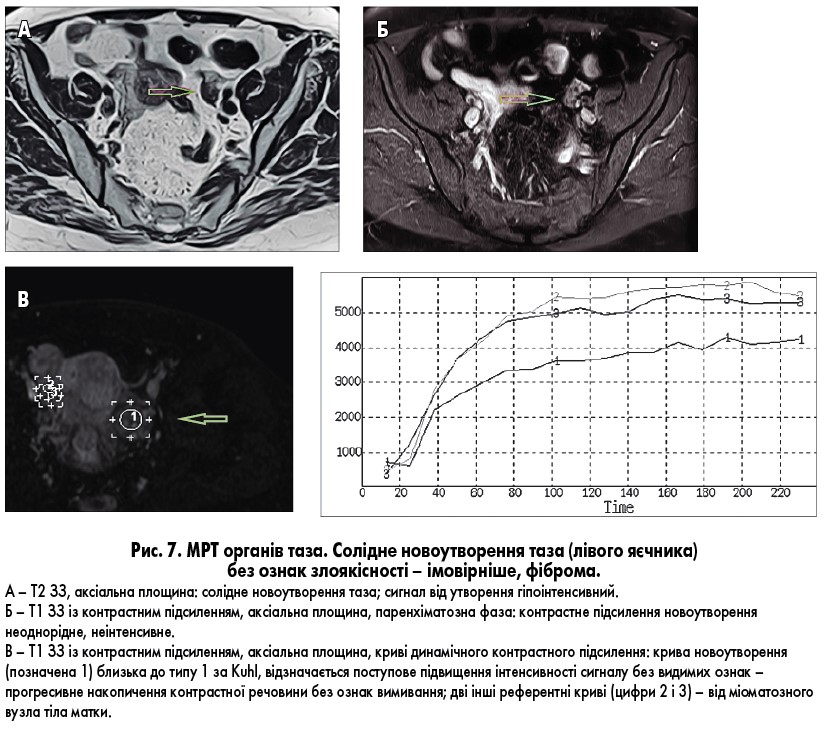 Загалом МРТ-картина при раку яєчника може бути різною. Пухлини найчастіше мають кістозний чи кістозно-солідний характер, повністю солідні новоутворення зустрічаються рідше. Розміри новоутворення на момент виявлення як правило значні, понад 2-3 см. Якщо брати до уваги сигнальні характеристики, то сигнал від солідних компонентів злоякісних пухлин дещо інтенсивніший на Т2 зважених зображеннях (ЗЗ) порівняно з нормальною тканиною яєчників. Варто пам’ятати, що низький сигнал на Т2 ЗЗ та ділянки грубого масивного звапнення можуть вказувати на міоматозний вузол, який може симулювати пухлину яєчника; цю імовірність слід брати до уваги при диференційній діагностиці. Важливими ознаками, що свідчать про злоякісність пухлини, є неоднорідна товщина, горбкуватість стінок кістозних компонентів, септальні перегородки в новоутворенні. Сигнал від вмісту кістозних компонентів може бути неоднорідним на всіх послідовностях, що інколи може маскувати м’якотканинні вегетації. Для точного оцінювання вмісту кістозних компонентів новоутворень яєчників рекомендується підсилення контрастування за допомогою внутрішньовенного введення радіофармпрепарату із використанням послідовностей із пригніченням сигналу від жирової тканини, постпроцесингом зображень із застосуванням субтракції, проекцій зображень найбільшої інтенсивності (Maximal intensity projections – МІР). Як додаткову субмодальність для вирішення суперечливих питань можна використовувати вивчення кривих динамічного контрастного підсилення. Тут працюють універсальні підходи: злоякісні пухлини характеризуються швидким накопиченням введеного внутрішньовенно радіофармпрепарату із подальшим застосуванням (ІІІ тип кривої), доброякісні – поступовим (прогресивним) накопиченням контрастної речовини (І тип кривої). Другий тип кривої підсилення характеризується початковим накопиченням радіофармпрепарату із подальшим сталим рівнем підсилення (плато) і є проміжним, переважно зустрічається при доброякісних новоутвореннях і рідко – при злоякісних [7].
