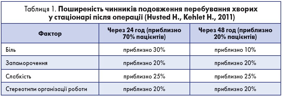 H. Husted і H. Kehlet (2011) проаналізували чинники, що зумовлюють подовження перебування хворих у стаціонарі після операції (табл. 1). Доповідач представив дані з власного досвіду застосування принципів Fast Track в абдомінальній хірургії. У період із вересня 2011 року до вересня 2018 року співробітниками кафедри виконано 564 операції з використанням зазначених принципів, які включали: