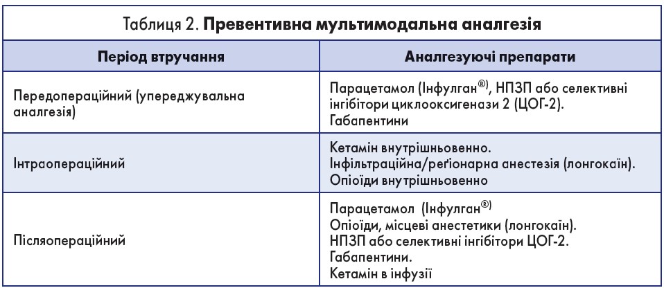 - мультимодальна аналгезія (НПЗП, парацетамол, місцеві анестетики);