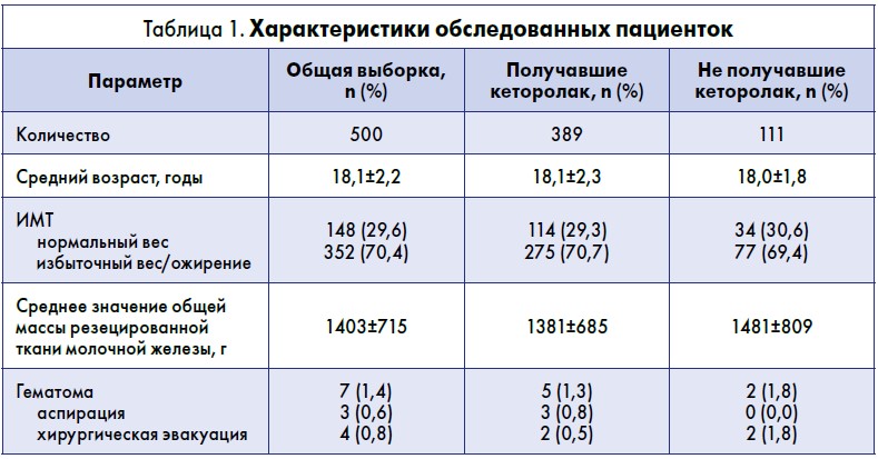 В исследование было включено 500 женщин. Средний возраст на момент операции составил 18,1±2,2 года, в среднем общая масса резецированной ткани молочной железы составила 1403±715 г. Большинство участниц исследования (70,4%) имели избыточный вес или ожирение. Одна пациентка в общей выборке страдала болезнью Виллебранда; каких-либо других заболеваний из группы геморрагических диатезов у остальных участниц диагностировано не было. Также не зарегистрировано случаев почечной недостаточности, гиперчувствительности к кеторолаку или другим НПВП.