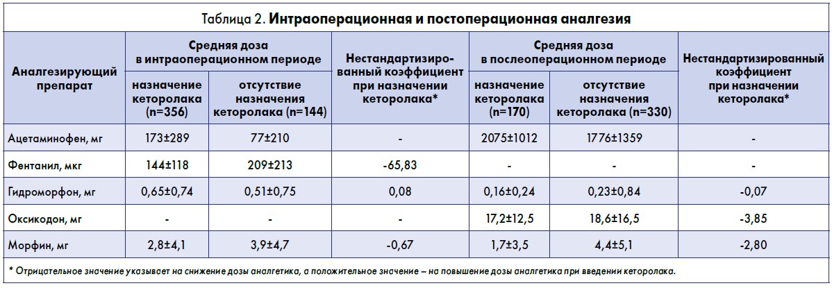 Пациенткам, которым вводили кеторолак интраоперационно, назначали значительно меньшую дозу фентанила и морфина (р<0,001), но большую гидроморфона (р<0,001). На фоне применения кеторолака в послеоперационном периоде пациенткам значительно реже требовалось введение оксикодона и морфина (р<0,001).