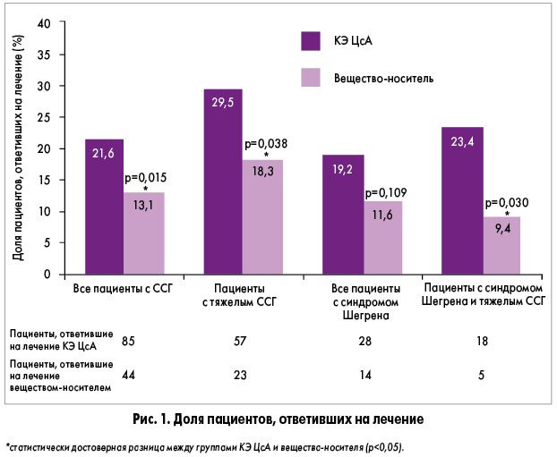 Из 734 включенных в анализ пациентов с ССГ 395 применяли КЭ ЦсА, 339 – вещество-носитель. Большинство участников (84,7%) составляли женщины. У 43,5% наблюдалась тяжелая форма ССГ; у 36,6% – синдром Шегрена.