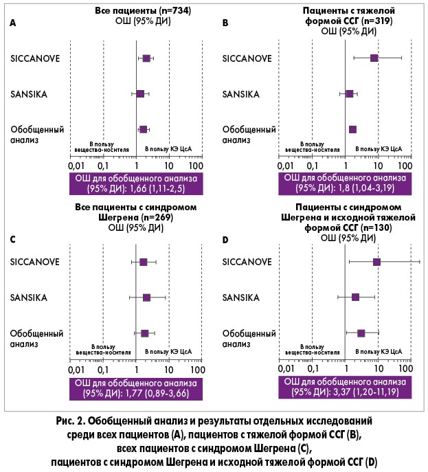 Анализ отношения шансов (ОШ) ответа на лечение по показателям ОРФ и ИЗПГ иллюстрирует такую же тенденцию в пользу преимущества ЦсА во всех подгруппах, кроме общей подгруппы участников с синдромом Шегрена (рис. 2). В группе общего анализа ОШ составило 1,66 (95% доверительный интервал (ДИ) 1,11-2,50), в подгруппе участников с тяжелой формой ССГ – 1,80 (95% ДИ 1,04-3,19) (рис. 2В). Показатели в группе с синдромом Шегрена и тяжелой формой ССГ также демонстрировали превосходство лечения ЦсА, а именно втрое большую вероятность ответа на терапию по сравнению с веществом-носителем (ОШ 3,37; 95% ДИ 1,20-11,19) (рис. 2D).