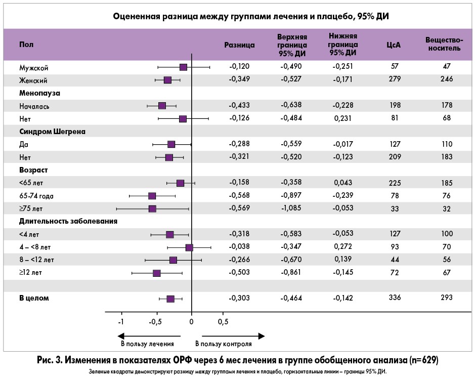 Улучшение показателей ОРФ через 6 мес было более выраженным в группе ЦсА, чем среди участников, применявших вещество-носитель (рис. 3). Достоверное превосходство ЦсА наблюдалось в большинстве проанализированных подгрупп. Клинические преимущества были наиболее выражены в группе лиц пожилого возраста (65-74 года) и женщин, особенно в периоде менопаузы. Следует отметить, что лечение КЭ ЦсА способствовало улучшению состояния глаза по ОРФ независимо от наличия синдрома Шегрена.