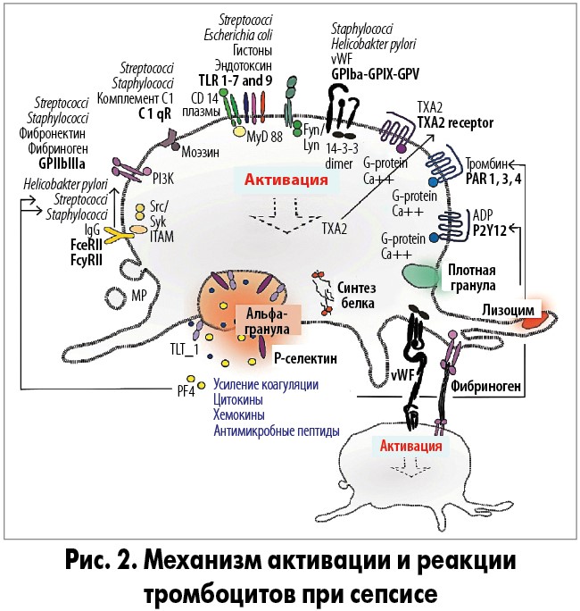 В интактной системе крообращения тромбоциты циркулируют с высокой скоростью сдвига и находятся в неактивном состоянии благодаря простациклину и оксиду азота, выделяемых эндотелиальными клетками. При сепсисе воспаление вызывает коагуляцию и приводит к чрезмерному образованию тромбина, который является важным агонистом тромбоцитов. Тромбин действует на тромбоциты в первую очередь за счет необратимого связывания с клеточными PAR‑рецепторами (Protease-Activated Receptors), присутствующими на мембране тромбоцитов. При отщеплении N‑концевого фрагмента у этих рецепторов происходит их активация. Рецептор PAR1 считается главным, высокоаффинным рецептором тромбина, в то время как PAR4 вносит вклад в активацию тромбоцитов, главным образом в условиях ингибирования PAR1 [51]. Кроме того, патогенез сепсиса характеризуется активацией эндотелия, которая приводит к экспрессии на эндотелиальных клетках субэндотелиального коллагена, vWF и тканевого фактора. Коллаген и vWF могут связываться с рецепторами тромбоцитов GPVI и GPIbα-GPIX-GPV, а тканевой фактор дополнительно инициирует внешний путь коагуляции приводя к продуцированию больших количеств тромбина [52]. При бактериальной инфекции активируется также система комплемента. Эта активация приводит к образованию белков, которые способствуют лизису и опсонизации микроорганизмов. Происходит регуляция воспалительной реакции, при которой имеется связь между врожденным и адаптивным иммунным ответом. Было показано, что С1q дополнительно может активировать тромбоциты через рецептор C1qR. Активация через FcyRIIa зависит от IgG и GPIIb/IIIa. Тромбоцитарный фактор 4 (PF4) связывается с бактериями и уменьшает время задержки агрегации. Циркулирующие патогены и высвобождающиеся патоген-ассоциированные молекулярные структуры, такие как гистоны, участвуют в активации тромбоцитов во время сепсиса через сигнализацию TLR. Активированный GPIIb/IIIa опосредует активацию тромбоцитов благодаря своей способности связывать растворимый фибриноген. Активация тромбоцитов усиливается через коагуляционный каскад, высвобождение TXA2 и ADP, приводит к изменению их формы, образованию агрегатов, выделению биологически активных веществ из гранул (рис. 2).