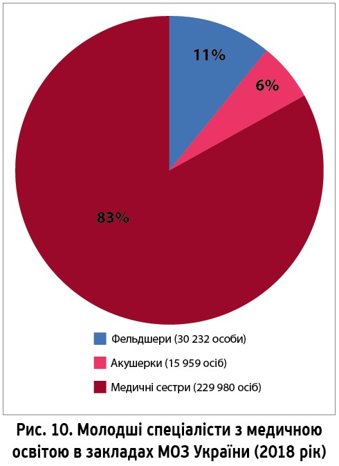 У 2018 році в Україні працювали 345 364 молодші спеціалісти з медичною освітою (середній медичний персонал). Забезпеченість на 10 тис. населення становила 82,3. Переважна більшість із них, а саме 313 412 осіб (90,8%), працювали в закладах МОЗ України (забезпеченість на 10 тис. населення – 74,7). Станом на 2018 рік у закладах МОЗ працювали 30 232 фельдшери, 15 959 акушерок, 229 980 медичних сестер (рис. 10).