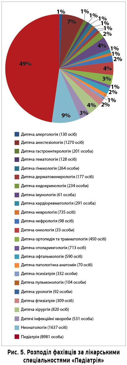 До розділу «Педіатрія» належать 25 лікарських спеціальностей, за якими працюють 18 251 особа, зокрема 8981 педіатр (49%) і 9270 високоспеціалізованих фахівців (51%). Співвідношення останніх до лікарів первинної спеціалізації становить 1:1. Водночас, за даними НСЗУ, 4398 педіатрів є лікарями первинної ланки (рис. 5).
