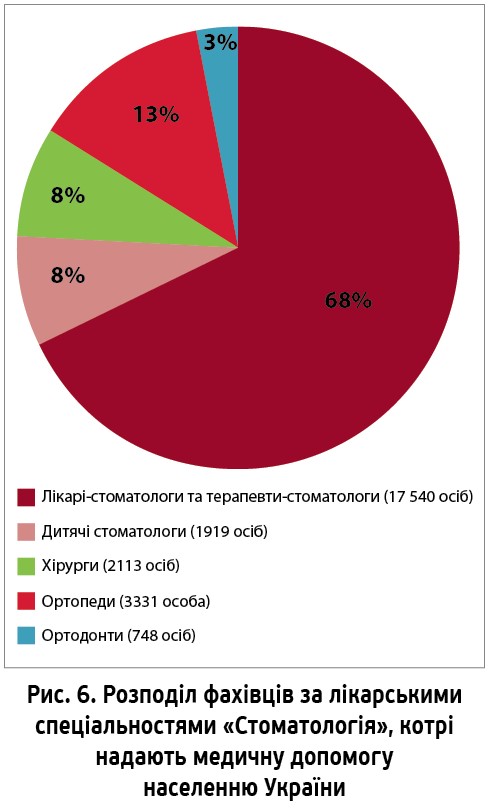 У 2018 році в Україні працювали 25 651 стоматолог, а саме 17 540 лікарів-стоматологів і терапевтів-стоматологів, 1919 дитячих стоматологів, 2113 хірургів, 3331 ортопед і 748 ортодонтів (рис. 6).