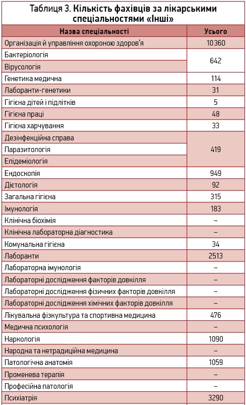 Відповідно до затвердженої номенклатури, розділ «Інші» включає 58 спеціальностей, за якими працюють 35 743 фахівці. Найбільшою є кількість спеціалістів з організації й управління охороною здоров’я – 10 360, у тому числі 945 фахівців зі статистики (табл. 3, рис. 7).