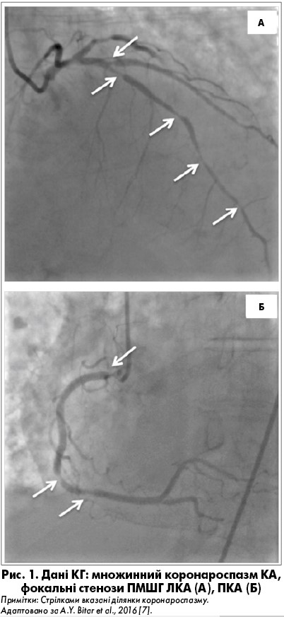 У літературі є повідомлення про розвиток ГКС, що ускладнився фібриляцією шлуночків, зупинкою серця, а про проведенні КГ виявлений коронароспазм передньої міжшлуночкової гілки (ПМШГ) лівої КА (ЛКА) та правої КА (ПКА), що минув після інтракоронарного введення нітрогліцерину [6]. Крім того, описаний розвиток ГКС з елевацією сегмента ST, що ускладнився кардіогенним шоком як першим проявом ЕГПА. У пацієнтки за даними КГ (рис. 1) виявлений множинний спазм КА (ПМШГ ЛКА, першої діагональної, проміжної гілок, ПКА, задньої міжшлуночкової гілки ПКА). Після інтракоронарного введення верапамілу та нітрогліцерину значно зменшився стеноз ПКА, а ПМША та її гілок – незначно, тому проведено імплантацію елютинг-стентів у ПМШГ ЛКА і першу діагональну гілку ЛКА. Проте на тлі приймання нітратів тривалої дії та антагоністів кальцію у пацієнтки відмічали стенокардію, яка пройшла після призначення ГК [7].