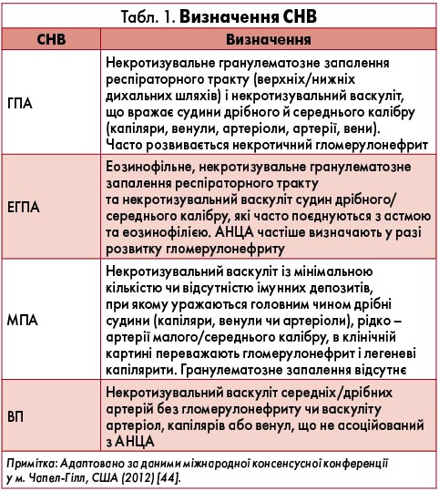 СНВ класифікуються відповідно до переважного типу уражених судин: при ВП у патологічний процес залучаються здебільшого судини середнього калібру, при MPА, ГПА та ЕГПА – дрібного, визначення яких наведене у таблиці 1 [44].