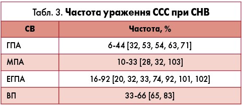 Частота ураження ССС наведена у таблиці 3. До патологічного процесу можуть залучатися всі структури серця: епікард, міокард, перикард, ендокард, коронарні артерії (КА), провідна система серця [63, 78]. Різні, потенційно небезпечні для життя ураження ССС діагностують у пацієнтів із СНВ, як-от міокардит, ендокардит, перикардит, АГ, коронарит із розвитком стенокардії та інфаркту міокарда (ІМ), клапанні вади серця, рестриктивна й дилатаційна кардіоміопатія, порушення ритму і провідності серця, раптова серцева смерть, застійна СН [35, 63, 71, 77, 78, 108].