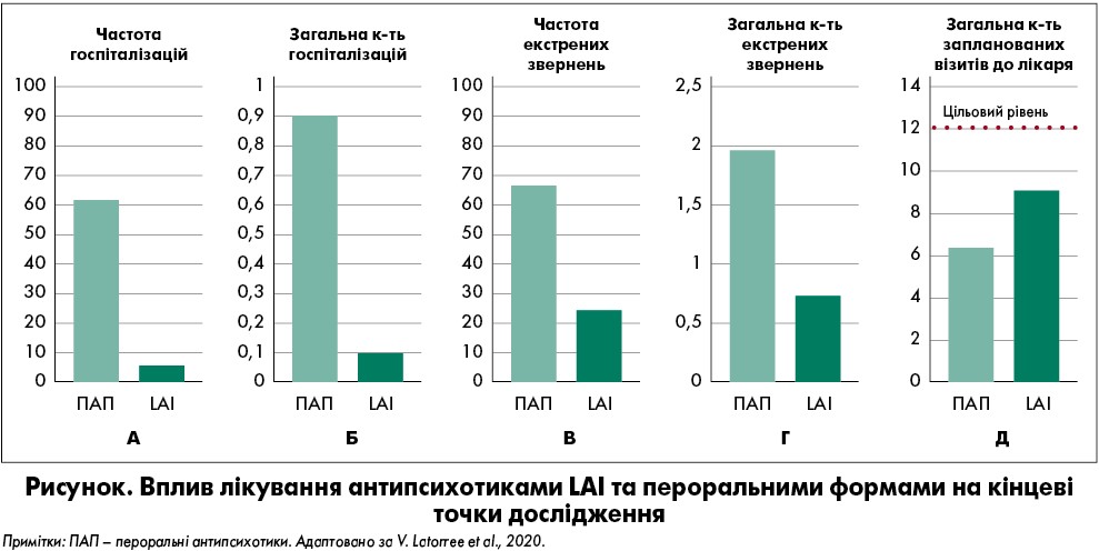 Отримані результати, підкріплені наявними даними літератури, показали, що ефективність антипсихотичного лікування є вищою при застосуванні LAI. Нова концепція, застосована дослідниками, передбачала орієнтування на оптимізацію клінічних процесів та ресурсів охорони здоров’я за допомогою терапії LAI з точки зору не лише частоти госпіталізацій, але й кількості екстрених та планових звернень, які рідко враховуються у випробуваннях, присвячених ефективності антипсихотиків (Kishimoto et al., 2013). Також було показано, що за всіма основними кінцевими точками використання антипсихотиків LAI пов’язане зі зниженням частоти госпіталізацій та звернень до лікарів через невідкладні випадки, а кількість запланованих амбулаторних візитів значуще зросла (Tiihonen et al., 2017; Alphs et al., 2014). Це свідчить, що терапія антипсихотиками LAI асоційована із кращим розподілом медичних ресурсів у галузі психічного здоров’я, збільшенням уваги до потреб пацієнтів та часу, приділеного психосоціальним втручанням, як це запропоновано в низці міжнародних рекомендацій (Fiorillo et al., 2014; Pompili, Fiorillo, 2018; NICE, 2014).