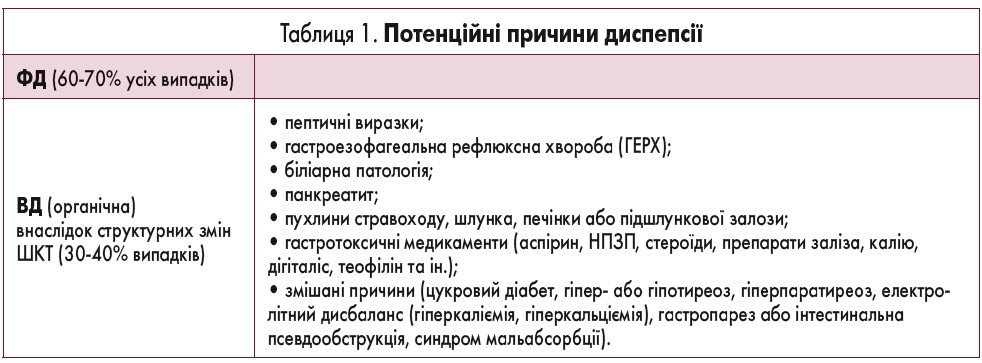 Диспепсія не є специфічним синдромом і може зустрічатися при різній патології шлунково-кишкового тракту (ШКТ) – як органічній, так і функціональній. Приблизно у 60-70% пацієнтів з диспепсією будь-яких структурних змін з боку гастродуоденальної ділянки при езофагогастродуоденоскопії (ЕГДС) не виявляється і ці хворі вважаються такими, що страждають на функціональну диспепсію (ФД). ФД зустрічається приблизно у 7-12% усього населення розвинутих країн, причому значно частіше хворіють люди у молодому та середньому віці. Приблизно у 30-40% пацієнтів диспепсичні скарги зумовлені органічною патологією. В таких випадках мова йде про вторинну (органічну) диспепсію (ВД), основні причини якої наведені у таблиці 1.