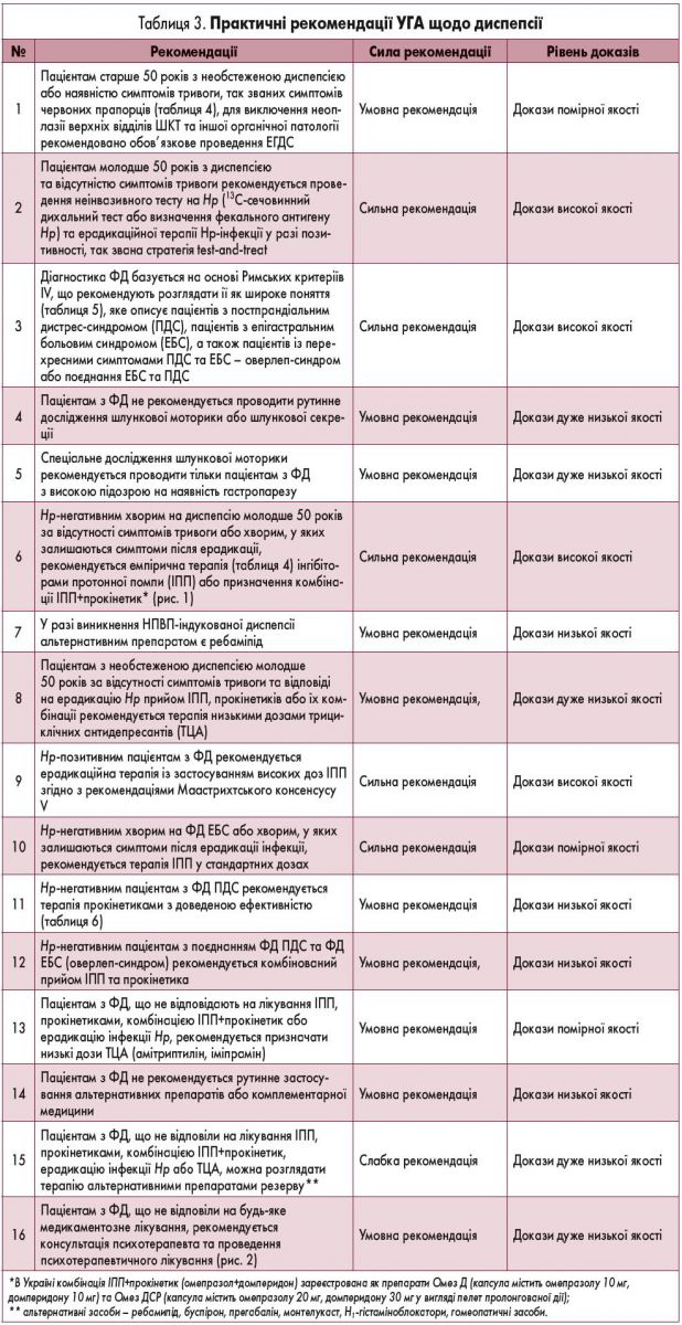 Українська гастроентерологічна асоціація (УГА) запропонувала та затвердила 6 тверджень (таблиця 2) та 15 практичних рекомендацій (таблиця 3) по веденню хворих на диспепсію. Ці рекомендації засновані на даних, що є в електронних базах PubMed, NCBI, CochraneLibrary, Research-Gate, GoogleScholar, а також на рекомендаціях провідних міжнародних гастроентерологічних та інших асоціацій і товариств – AGA, СAG, ACG, NICE, UEG. При їх підготовці враховували тільки оригінальні (проспективні, рандомізовані, контрольовані та подвійні сліпі) дослідження, систематичні огляди та метааналізи. Для оцінки якості фактичних даних щодо фармакологічних методів лікування диспепсії застосована система GRADE, згідно якої для оцінки виділяють високий, середній, низький та дуже низький рівні доказів. Високий рівень доказів свідчить про те, що подальші дослідження для зміни думки відносно ефективності втручання не потрібні. Середній (помірний) рівень доказів передбачає необхідність додаткових досліджень, а низький означає, що очікуються нові дослідження, які можуть змінити думку відносно ефективності втручання. Дуже низький рівень означає, що докази сумнівні або конфліктні, а співвідношення ризик/користь точно не встановлено. Усі рекомендації представлені з урахуванням їх сили: сильні передбачають суттєву перевагу метода/втручання над ризиком його застосування, у зв’язку з чим суворо рекомендовані; слабкі рекомендації балансують на грані співвідношення ризик/користь.