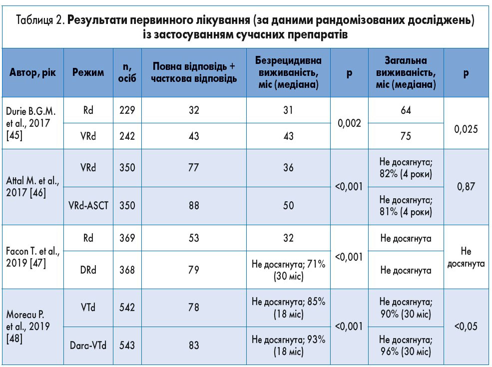 Наразі стандартом лікування вперше діагностованої мієломи у хворих, які можуть бути кандидатами на трансплантацію стовбурових клітин, є режим VRd. За даними B.G.M. Durie та співавт. (2017), частота відповіді на проведене лікування, безрецидивна та загальна виживаність були значно кращими при використанні VRd у порівнянні з Rd [45]. Всі пацієнти, які отримують леналідомід, потребують медикаментозної профілактики тромбозу. Якщо режим VRd недоступний, можливе призначення VTd або VCd. Додатковою альтернативою для пацієнтів, які не є кандидатами на трансплантацію стовбурових клітин, є режим із використанням даратумумабу (DRd). Перспективною зарекомендувала себе комбінація Dara-VTd, проте остаточні результати впливу на загальну та безрецидивну виживаність наразі ще очікуються [48].