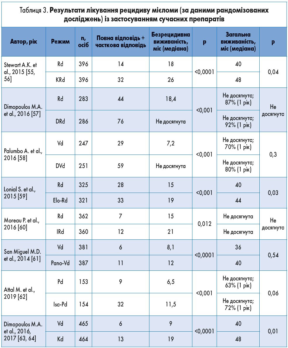 Практично у всіх пацієнтів із множинною мієломою з часом виникає рецидив. До впровадження даратумумабу медіана безрецидивної та загальної виживаності при рефрактерності до леналідоміду та бортезомібу була низькою [54]. Загальні принципи вибору тактики лікування наведені на рисунку 2, а результати ключових досліджень зведені в таблиці 3. Впровадження новітніх препаратів (у тому числі даратумумабу, карфілзомібу, ізатуксимабу, елотузумабу, панобіностату) дозволило істотно покращити як показники загальної відповіді на терапію, так і подовжити безрецидивну виживаність хворих з рецидивом мієломи.