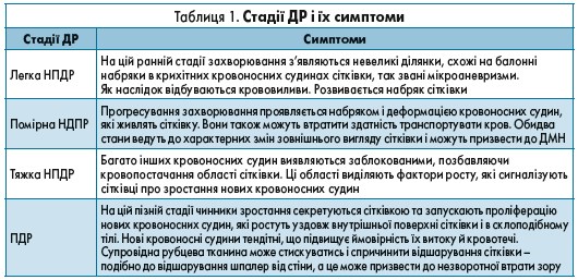 У цілому ретинопатія починається з легких непроліферативних порушень, що характеризуються збільшенням числа мікроаневризм, які можуть розростатися та стоншуватись. Зі збільшенням ступеня тяжкості спостерігається підвищення проникності та оклюзії судин, а також прогресування від помірної і тяжкої НПДР до ПДР, що характеризується зростанням нових кровоносних судин на сітківці і задньої поверхні склоподібного тіла. Визначення стадій ДР представлено в таблиці 1.