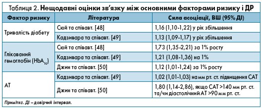 У декількох епідеміологічних дослідженнях описані показники прогресування ДР. Когорта з найтривалішим періодом спостереження – Вісконсінське епідеміологічне дослідження ДР (WESDR), в якому повідомлялося про 25-річне прогресування ДР у пацієнтів із діабетом 1 типу. WESDR почав набір у 1979 р., коли можливості глікемії, кров’яного тиску і ліпідного контролю були помітно обмежені, якщо порівняти з доступними сьогодні варіантами. Фактори ризику, виявлені під час WESDR – більш тривалий перебіг діабету, підвищені гіперглікемія, кров’яний тиск і дисліпідемія, – залишаються актуальними, тоді як показники прогресування в більш пізніх дослідженнях можуть помітно відрізнятися. Наприклад, дані WESDR передбачили приблизно 40% частоту прогресування протягом 4 років для дослідження «Дія з контролю серцево-судинного ризику при діабеті (ACCORD)», але фактична частота прогресування в пацієнтів із діабетом 2 типу на момент завершення дослідження склала всього 10%. У таблиці 2 представлені відношення шансів (ВШ), пов’язаних із найбільш послідовно асоційованими факторами ризику ретинопатії в дослідженнях, проведених у сучасних умовах контролю глюкози, ліпідів і АТ [1].