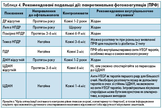 Хоча оптимізація рівнів глюкози в крові, АТ та ліпідів у сироватці крові в поєднанні з відповідним плановим розширеним оглядом очей може суттєво знизити ризик втрати зору від ускладнень ДР, у значної частини хворих на діабет розвиваються ДМН або проліферативні зміни, які потребують втручання (табл. 4.) [3].