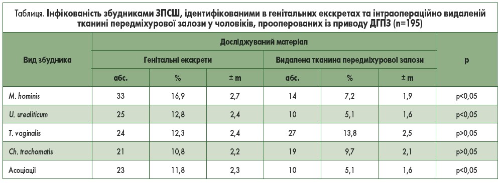 В інтраопераційно видаленій тканині передміхурової залози той чи інший збудник ідентифікували дещо рідше, ніж у генітальних екскретах – у 59 (30,1%) хворих на ДГПЗ. Найчастіше було діагностовано T. vaginalis – у 27 (13,8%) пацієнтів; рідше Ch. trachomatis – у 19 (9,7%) хворих, М. hominis – у 14 (7,2%), U. urealiticum – у 10 (5,1%). Лише у 10 (5,1%) хворих на ДГПЗ у тканині передміхурової залози містилися мікробні асоціації. Поєднання двох збудників зустрічалось у 9 (4,6%) пацієнтів, в 1 (0,5%) хворого на ДГПЗ виявили три збудники ЗПСШ.