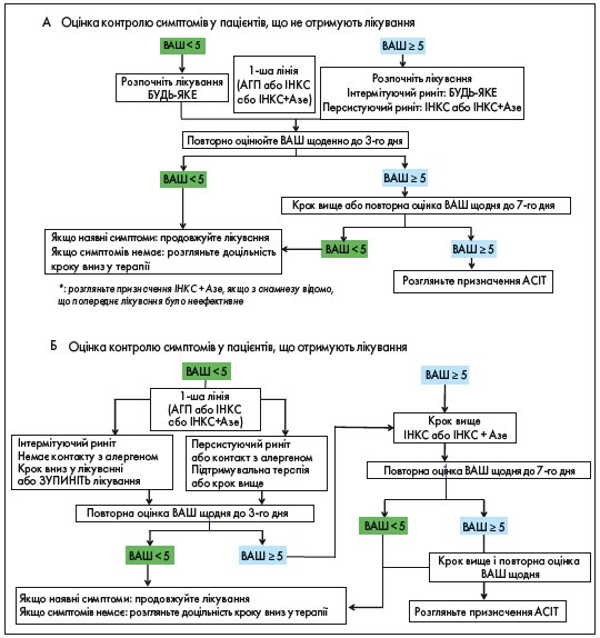 Рис. 1. Оновлені алгоритми ведення пацієнтів з АР залежно від індексу ВАШ (підлітки та дорослі), ARIA 2019