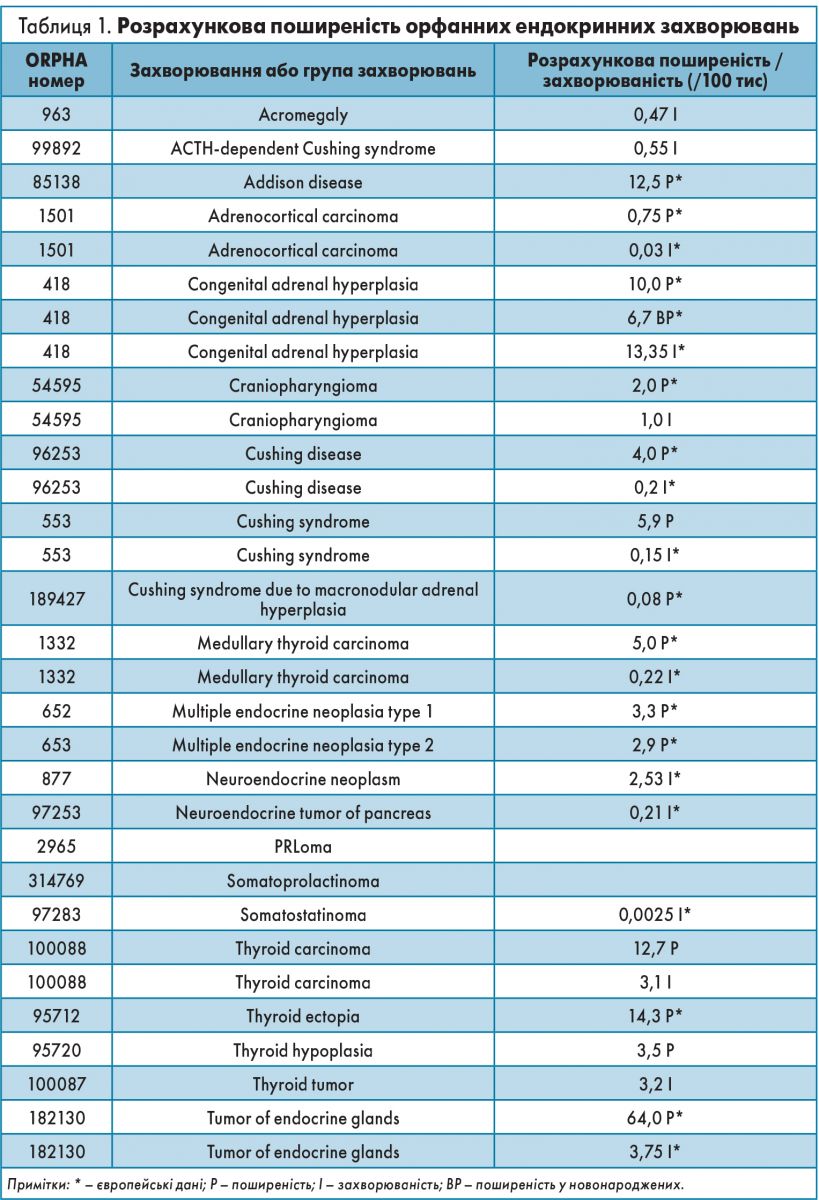 Вважається, що показник поширеності ОЗ не є уніфікованим. У різних країнах/регіонах критерії «орфанності» захворювання відрізняються і їх частота може коливатись. Рівень поширеності даних патологій може бути низьким в одному регіоні (чи популяції) та високим в іншому. Згідно з даними офіційного веб-сайту Європейського союзу (ЄС), в Європі будь-яке захворювання, що вражає <5 осіб на 10 тис, вважається рідкісним [1]. У більшості ж випадків захворювання вважають орфанними, коли вражається 1 людина на ≥100 тис осіб. У країнах ЄС на рідкісні захворювання страждає 6-8% населення, тобто від 27 до 36 млн людей [1]. Розрахункова поширеність орфанних ендокринних захворювань коливається від 0,08 до 64 випадків на 100 тис осіб [2] (табл. 1).