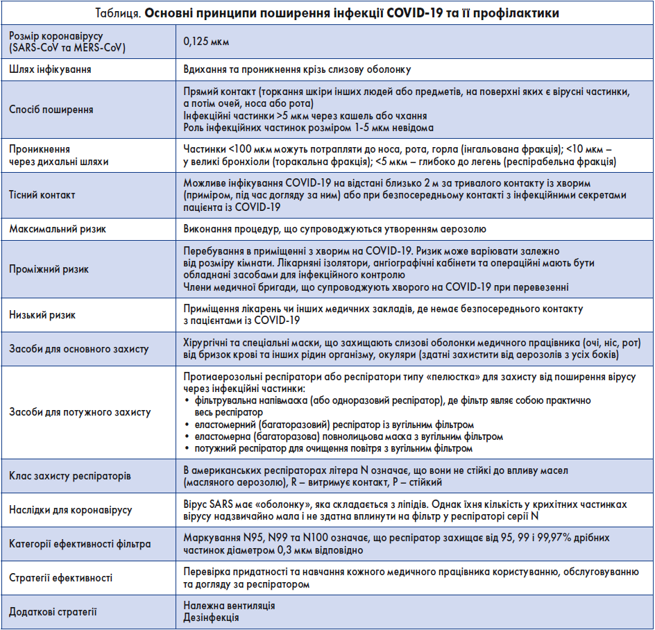 Доступні дані показують, що вірус SARS-CoV‑2 може бути наявним у повітряно-крапельній зависі частинок до 3 год (van Doremalen et al., 2020). Однак їхню роль у поширенні інфекції досі не визначено. Стандартні хірургічні маски можуть виявитися неефективними для забезпечення захисту, адже не призначені для щільного прилягання до обличчя та фільтрування інфекційних частинок. У 2003 р. застосування захисних масок, рукавичок, халатів та миття рук було ефективним у запобіганні внутрішньолікарняному поширенню тяжкого гострого респіраторного синдрому (Seto et al., 2003).