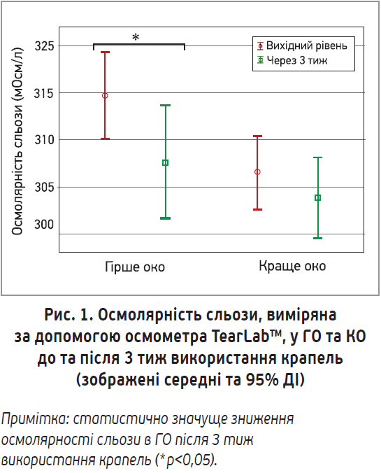 На початку середня осмолярність сльози в ГО становила 314,63±11,0 мОсм/л. Після 3 тиж використання крапель цей показник зменшився до 307,7±15,7 мОсм/л (р<0,05; рис. 1). У КО середня осмолярність до та після 3 тиж лікування становила 306,6±10,1 та 303,9±11,3 мОсм/л відповідно (р=0,228).