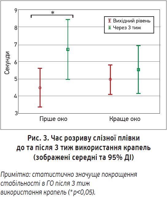 Середній показник NITBUT на початку становив 4,5±2,9 та 5,0±2,3 с (ГО та КО відповідно); після 3 тиж лікування він покращився до 6,7±4,6 та 5,6±3,6 відповідно (ГО р<0,05; КО р=0,46; рис. 3).